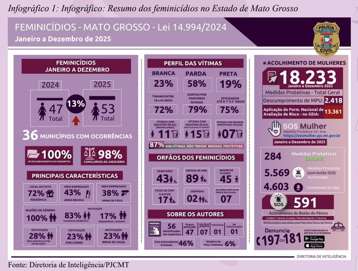 A Polícia Civil de Mato Grosso esclareceu 100% dos casos de feminicídio registrados em 2025 no Estado, conforme aponta o relatório de monitoramento dos crimes de gênero divulgado nesta semana. Ao todo, foram contabilizados 53 feminicídios em 36 municípios mato-grossenses, com 56 autores identificados — número superior ao total de ocorrências porque, em alguns casos, houve mais de um envolvido no crime.
