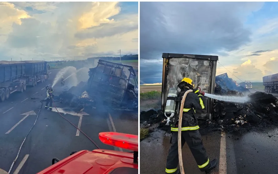 O Corpo de Bombeiros atendeu, na tarde desta quinta-feira (12), por volta das 14h10, um incêndio em uma carreta às margens da BR-163, no km 582, sentido Cuiabá, cerca de 5 km após a praça de pedágio, em Nova Mutum/MT.