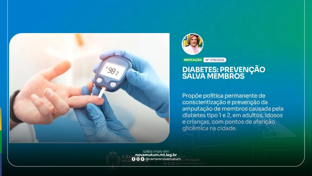 A saúde da população mutuense voltou ao centro das discussões na Câmara Municipal de Nova Mutum. Durante a 11ª sessão ordinária, realizada na quarta-feira, 22 de abril, os vereadores aprovaram por unanimidade a Indicação nº 078/2026, de autoria da vereadora Carmem Casagrande (União Brasil), que sugere ao Poder Executivo a criação de uma política permanente de conscientização e prevenção de amputações de membros decorrentes do diabetes tipo 1 e tipo 2, voltada a adultos, idosos e, especialmente, crianças.