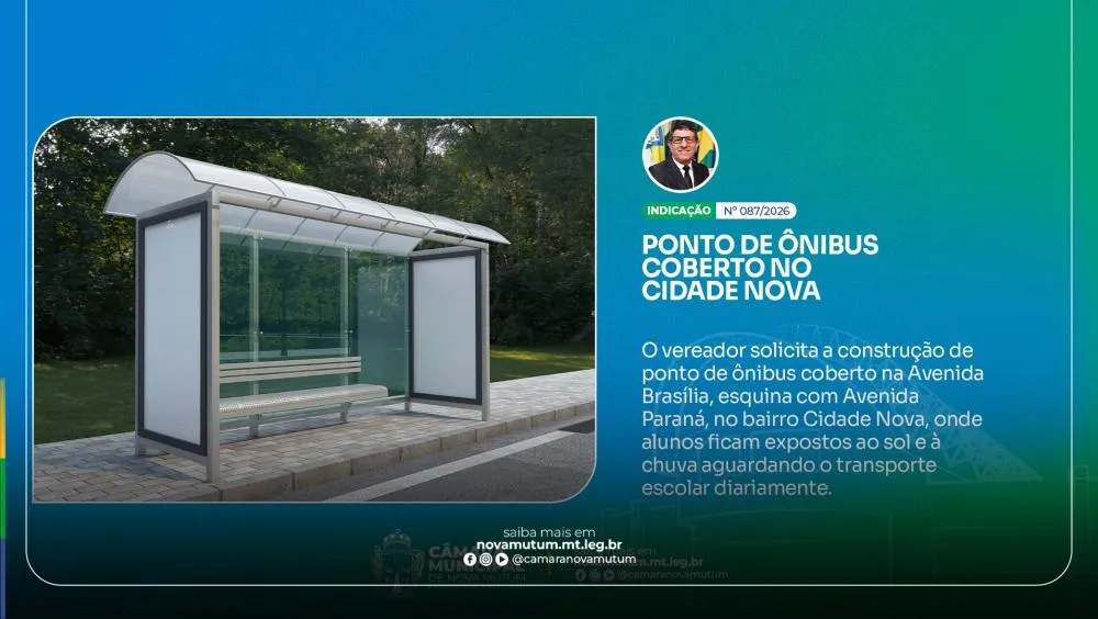 O parlamentar indicou ao Poder Executivo a necessidade da construção de um ponto de ônibus coberto na Avenida Brasília, esquina com a Avenida Paraná, no bairro Cidade Nova, garantindo mais conforto aos usuários do transporte coletivo.