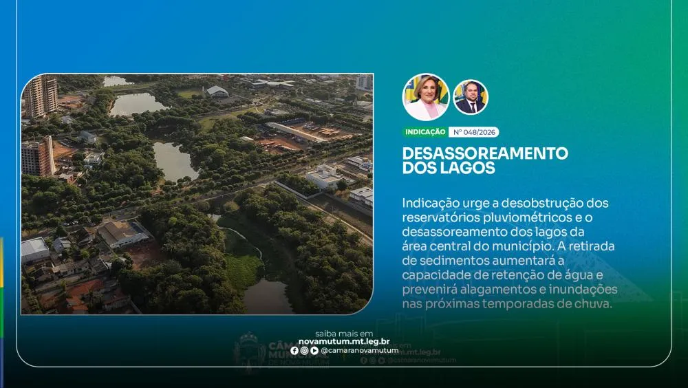 Quem passa pela área central de Nova Mutum sabe que os lagos distribuídos pelo perímetro urbano fazem parte da paisagem da cidade. Mas, por baixo dessa beleza, há um problema silencioso que preocupa parlamentares e moradores: o acúmulo de sedimentos que compromete a capacidade desses espelhos d’água de absorver as chuvas. Foi com esse olhar que a vereadora Carmem Casagrande (União Brasil), com coautoria do vereador Anderson Mantovan (União Brasil), apresentou a Indicação nº 048/2026 durante a 7ª sessão ordinária da Câmara Municipal, realizada na última segunda-feira, 23 de março.