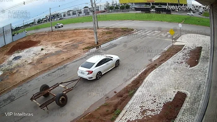 Uma carretinha foi furtada na madrugada de sexta-feira (13) no bairro Jardim Montreal, em Nova Mutum/MT., Imagens de câmeras de segurança mostram que, por volta das 01h40 da madrugada, um veículo Honda Civic de cor branca trafegava pela rua do bairro quando acabou colidindo em uma carretinha que estava estacionada.