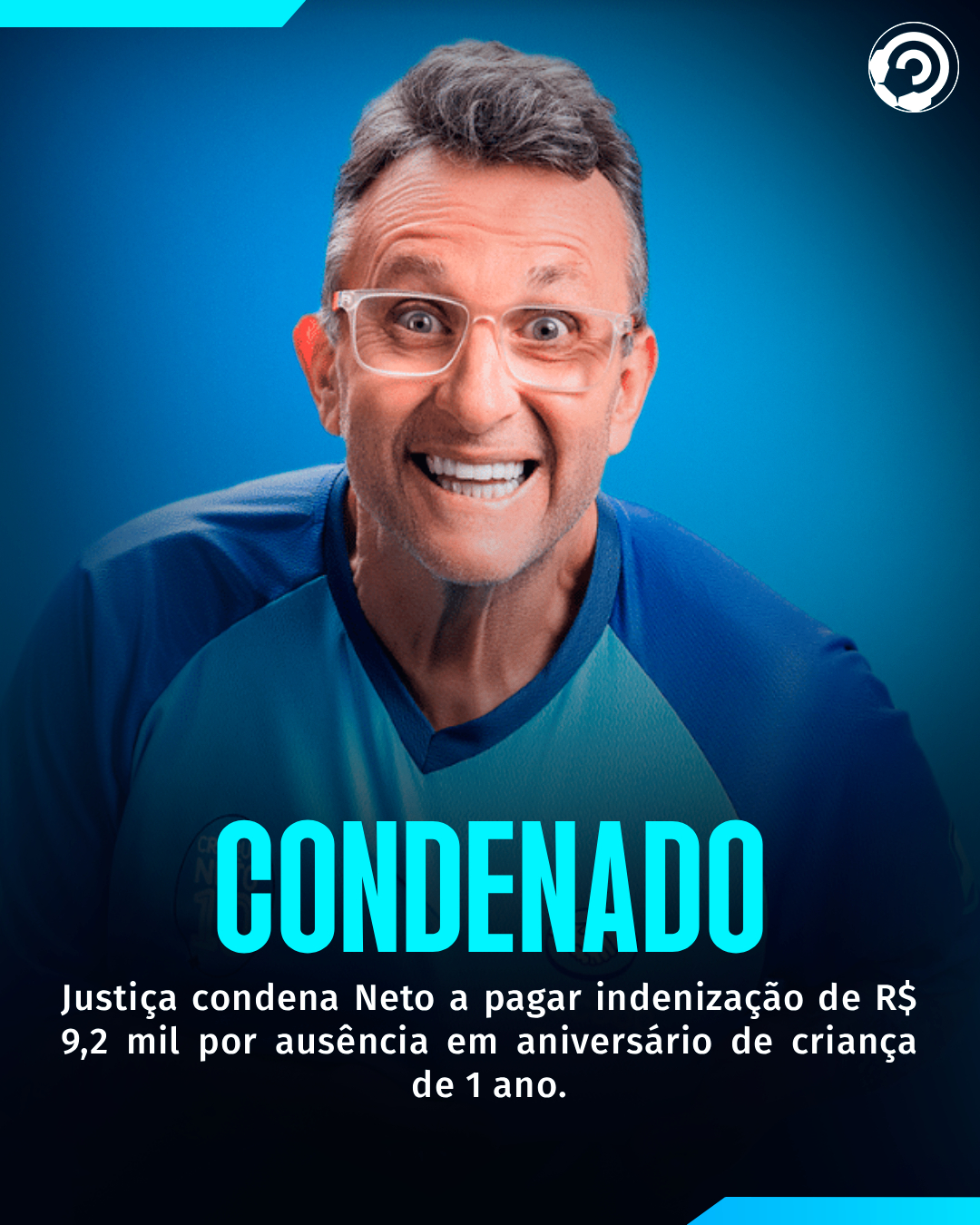 O apresentador Neto foi condenado pela Justiça a pagar R$ 9,2 mil de indenização após não comparecer a um aniversário infantil e a um jogo em Bebedouro (SP).