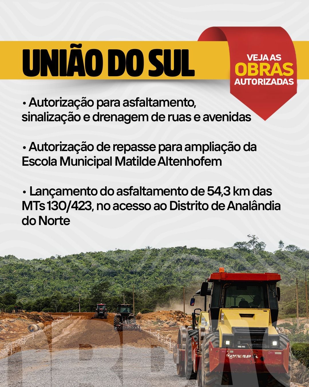 O GovMT deu o sinal verde para um pacote de obras que vai mudar a cara de União do Sul, Marcelândia e Cláudia. É mais asfalto, mais segurança nas estradas e investimentos reais na educação e no lazer da nossa gente.