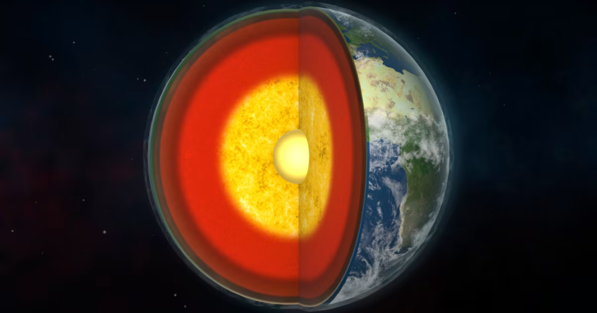 O núcleo interno, uma esfera sólida composta principalmente de ferro e níquel, situa-se a cerca de 5.100 quilômetros abaixo da superfície.
