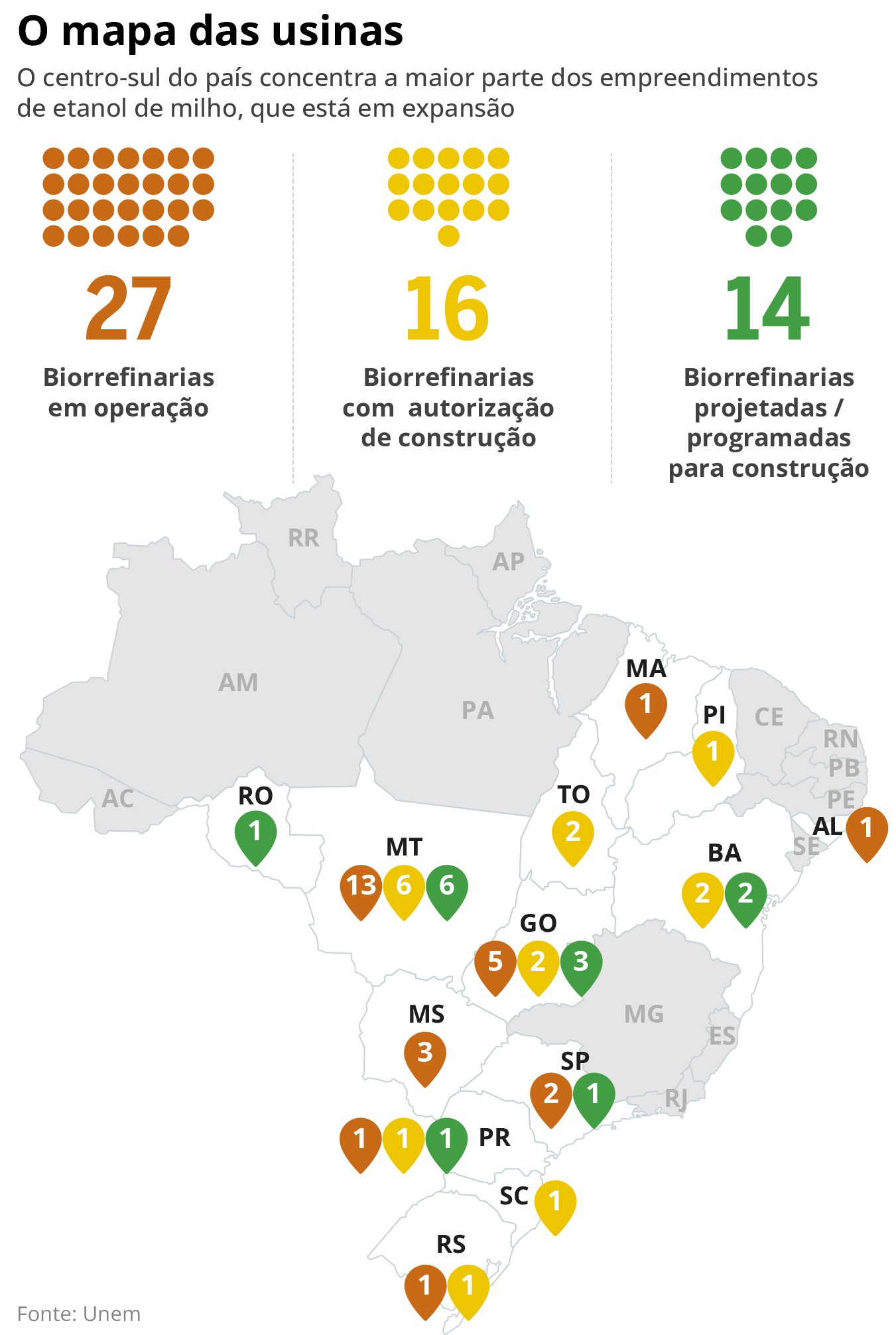 Mapeamento feito pela Unem mostra avanço de investimentos no setor. A Inpasa, maior empresa do setor de etanol de milho, tem três unidades em construção: em Luís Eduardo Magalhães, na Bahia, com inauguração prevista para o primeiro trimestre; outra sendo erguida em Rio Verde, Goiás, que fica pronta no fim do ano; e a terceira será em Rondonópolis, Mato Grosso, com inauguração em 2027.