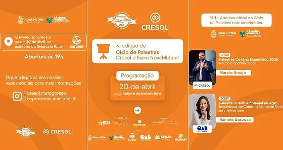 Em 2026, a iniciativa acontece no dia 20 de abril, no auditório do Sindicato Rural de Nova Mutum, com abertura oficial marcada para as 19h, contando com a presença de autoridades locais.