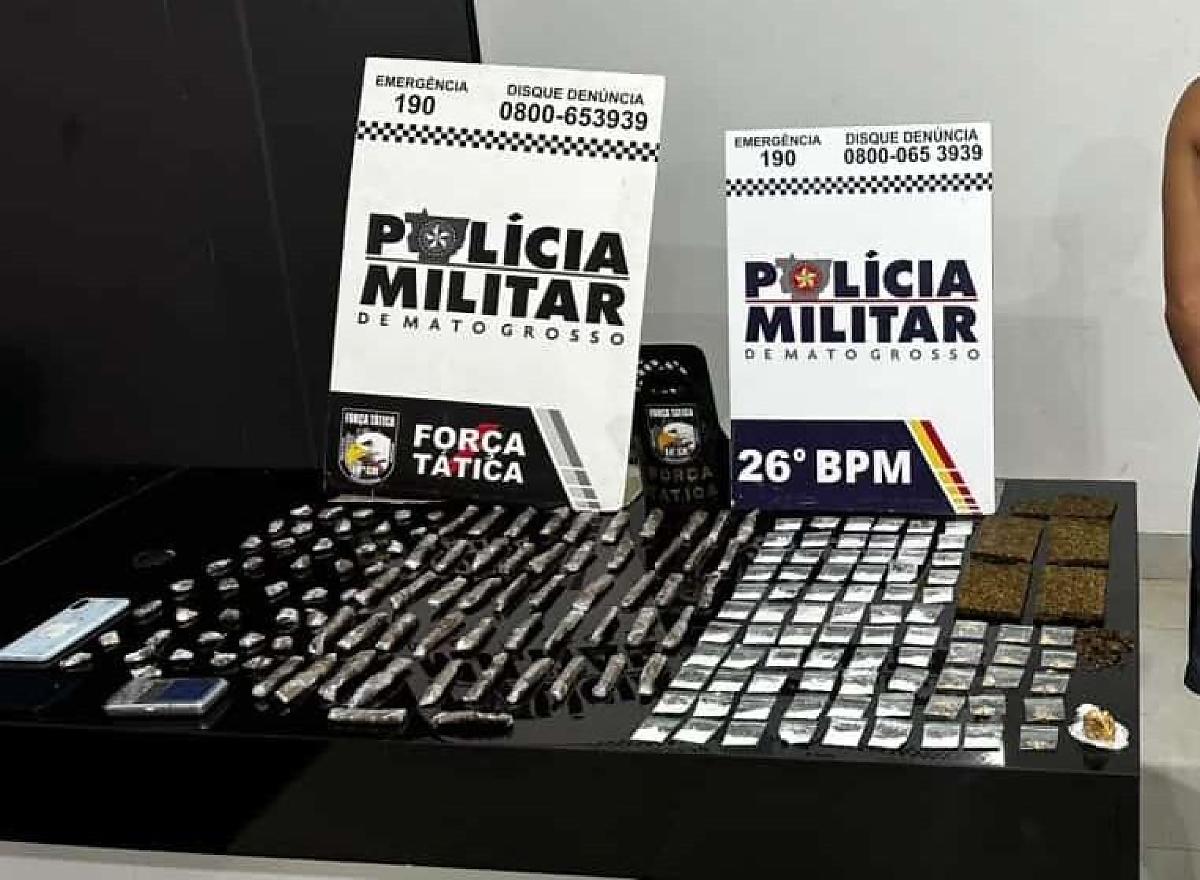 Policiais militares da Força Tática do 14º Comando Regional prenderam, nesta sexta-feira (27.3), um integrante de uma facção criminosa suspeito por tráfico ilícito de drogas, em Nova Mutum. Na ação, as equipes apreenderam 174 porções de substâncias análogas à maconha, cocaína e pasta base.