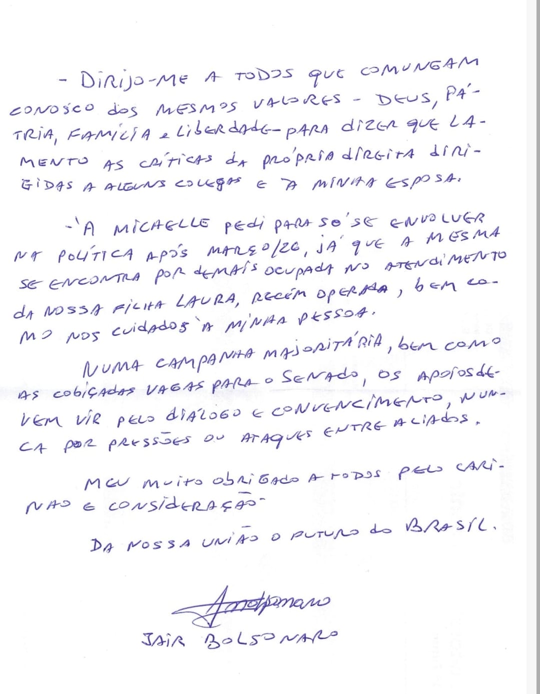 Em carta anterior, ele já havia afirmado estar incumbido de definir os nomes do partido que disputarão o Senado. Cargo que também pode entrar no radar de Michelle, enquanto o filho primogênito, o senador Flávio Bolsonaro (PL), é apontado como escolha para concorrer à Presidência.