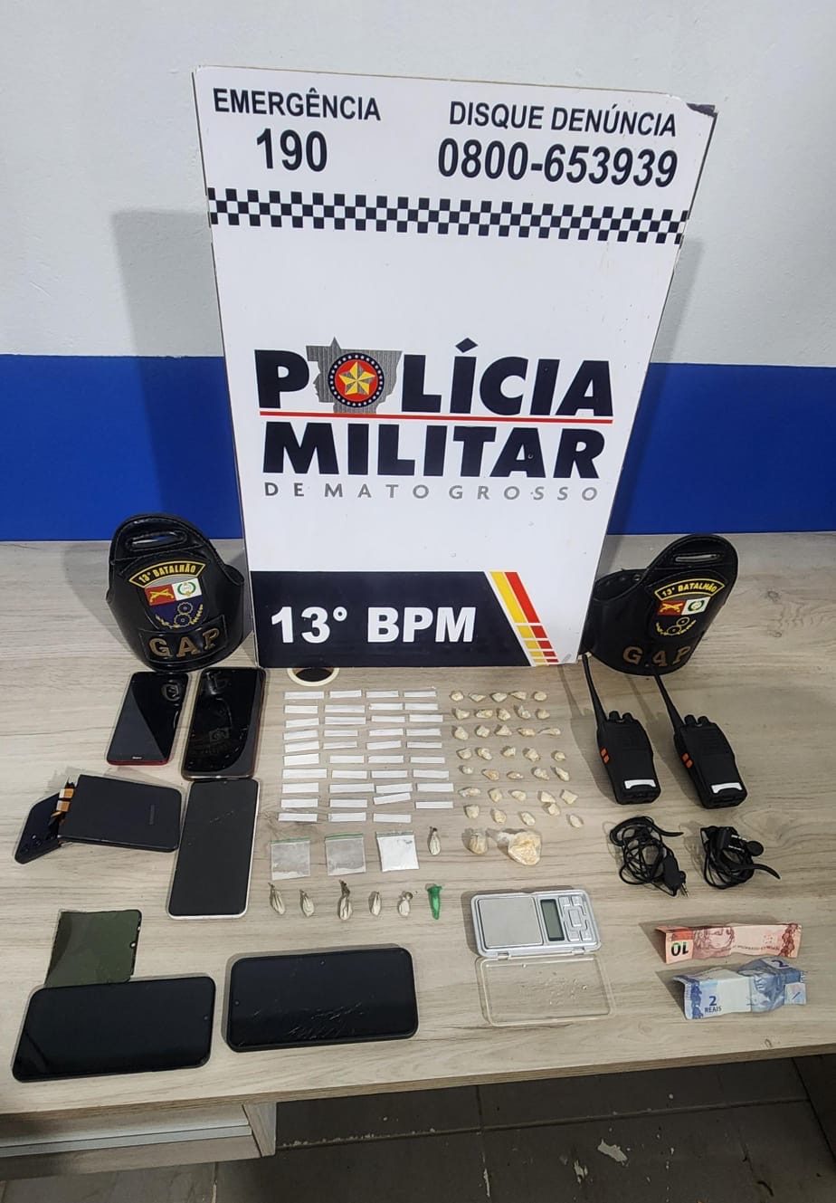 Nas buscas feitas nas proximidades, a equipe localizou outros aparelhos celulares escondidos em pontos distintos, uma balança de precisão e mais um rádio comunicador ocultado dentro de um vaso de planta. O material encontrado reforçou a suspeita de que o local era utilizado como ponto de apoio para a comercialização de drogas.