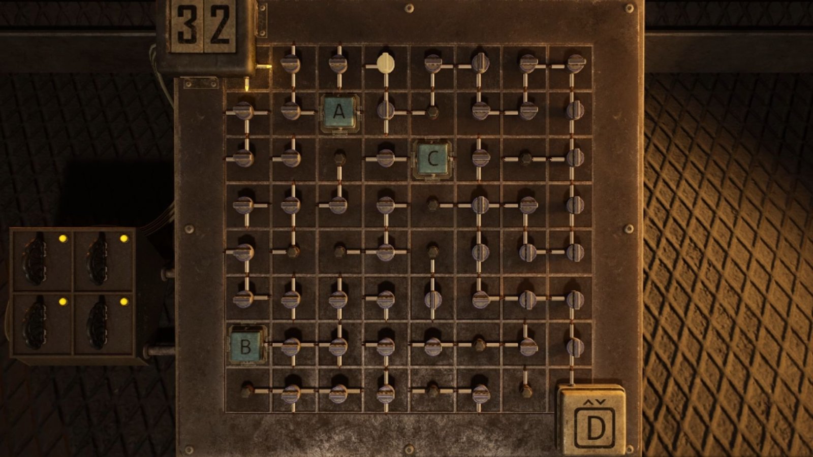 Neste puzzle, é preciso abrir quatro portas, cada uma com letras de A a D, utilizando circuitos elétricos. É preciso fazer o caminho, ao mesmo tempo em que você precisa controlar a quantidade de ligações disponíveis para fazer o trajeto. Confira o caminho de cada um deles: