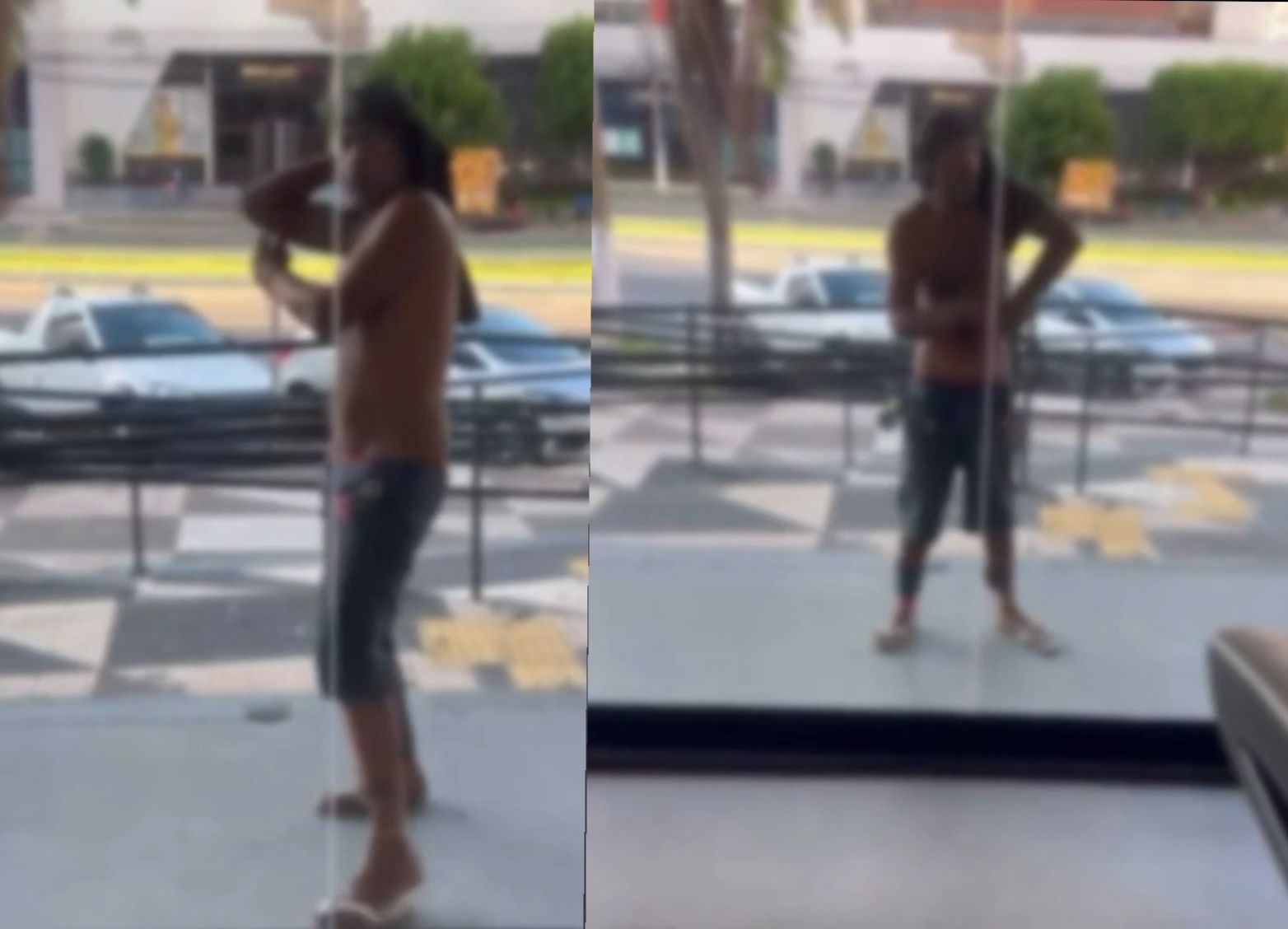 Uma pessoa que estava dentro do estabelecimento gravou o vídeo. O vidro permitia visão de dentro para fora, mas refletia como espelho para quem permanecia do lado externo. Nas imagens, o homem gesticula, encara o reflexo e discute com a própria imagem.