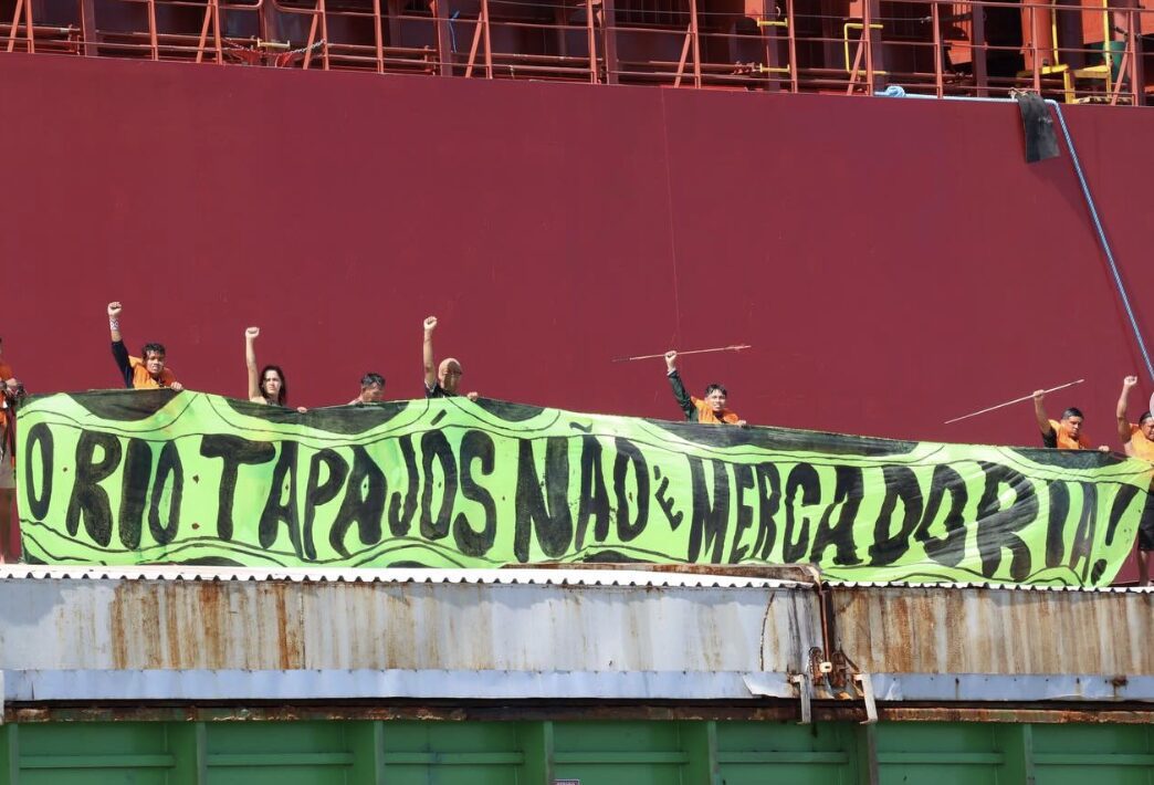 Faixas e palavras de ordem expuseram a ligação direta entre as obras na hidrovia e o avanço da exportação de commodities agrícolas, como a soja, apontado como uma das principais causas da expulsão de povos indígenas e camponeses.