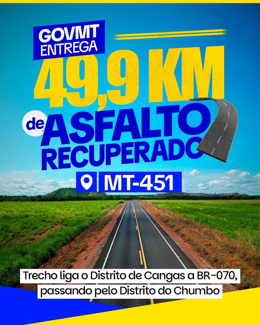 🛣️ A Rodovia Adauto Leite, em Poconé, está de cara nova. São 49,9 km de asfalto restaurado, com investimento de R$ 32,2 milhões.