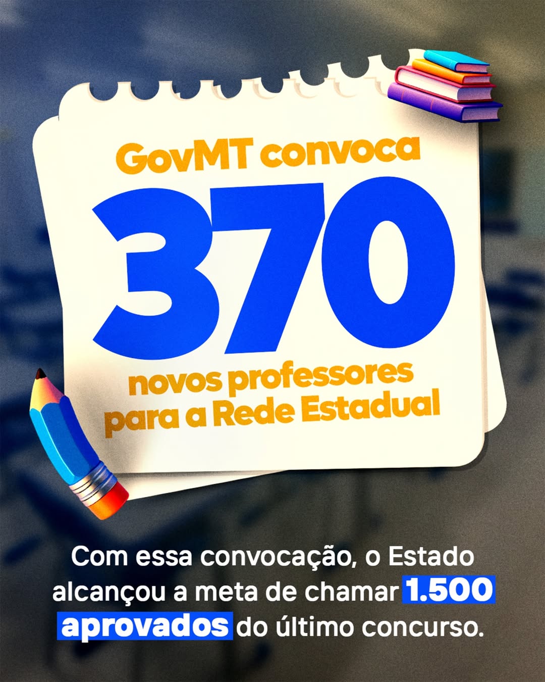 O GovMT acaba de convocar mais 370 professores do cadastro de reserva para reforçar a rede estadual de ensino. Com essa nova chamada, o Estado cumpre a meta de nomear 1.500 profissionais efetivos do concurso de 2025, garantindo educação de qualidade em todas as regiões.