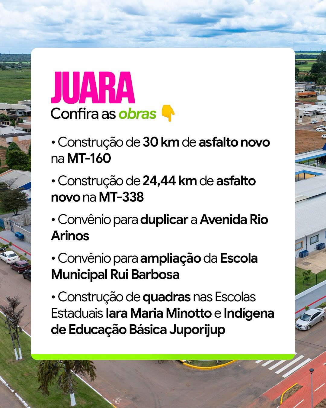 👉🏼 Investimentos em Juara com asfalto na MT-160 e MT-338, além de melhorias na Avenida Rio Arinos e em escolas locais.
