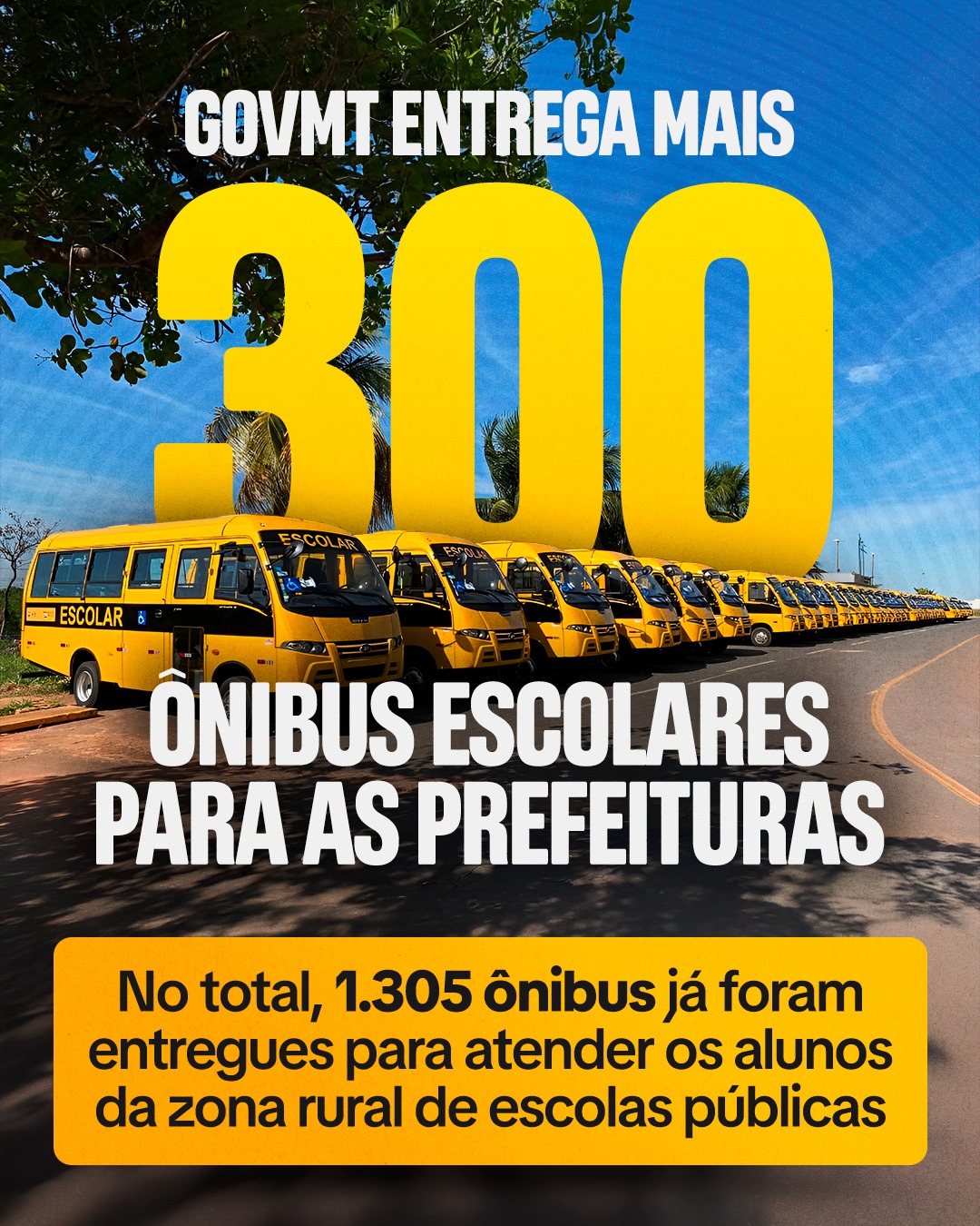 O GovMT entregou 300 ônibus escolares para as prefeituras, fortalecendo a educação em todas as regiões do Estado. Com essa ação, o total chega a 1.305 veículos entregues para garantir que nossos alunos cheguem à escola com segurança e conforto.