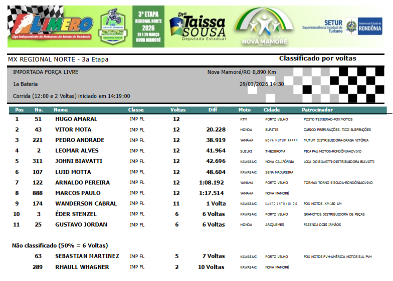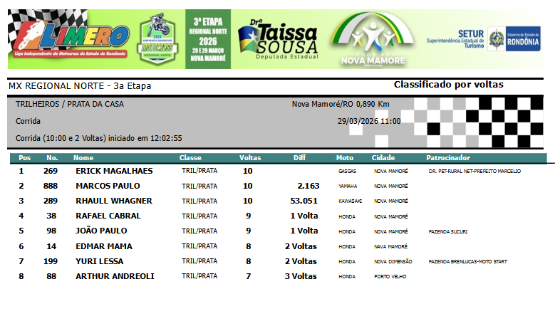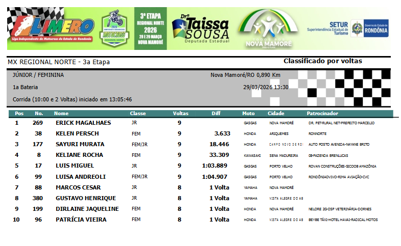 A segunda colocação ficou com a atleta de Campo Novo de Rondônia, patrocinada pela Sicoob Amazônia e Auto Posto Avenida, Sayuri Murata (#177), que corre com uma moto de reserva. Na terceira posição, a jovem promessa do MX, Luis Miguel #17, que teve que fazer uma corrida de recuperação, uma vez que, com um erro na curva de largada, perdeu muito tempo. Miguel corre com o apoio da Rovan Construções e Sicoob Amazônia.