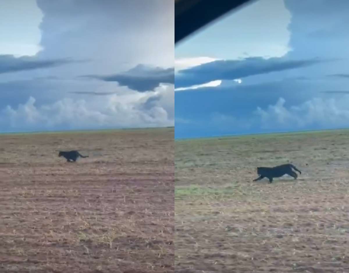 Uma onça-preta, considerada rara, foi flagrada correndo ao lado de um carro em uma fazenda na zona rural de Nova Mutum (241 km de Cuiabá). O registro chamou atenção pela proximidade do animal com o veículo e pela coloração incomum do felino.