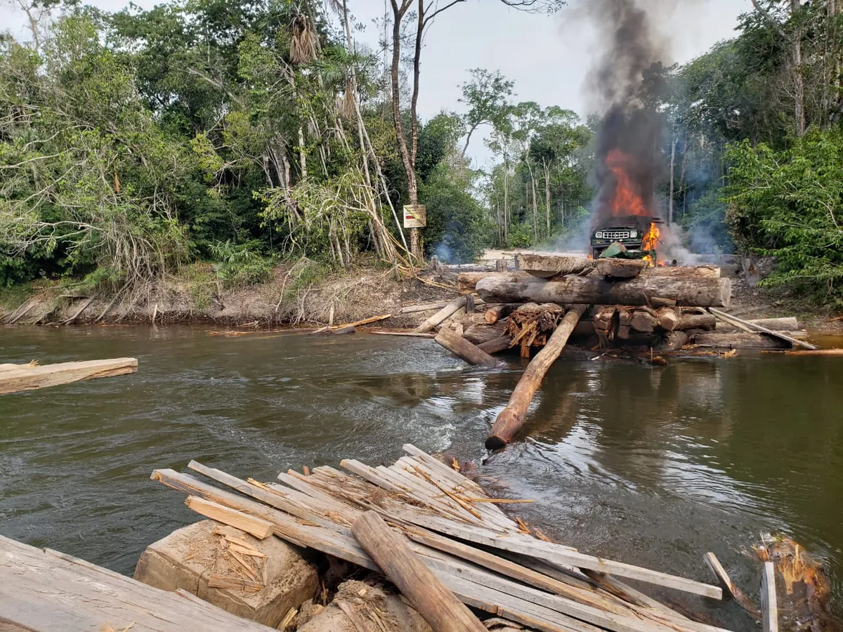 Ponte construída para transporte de madeira foi destruída em terra indígena.