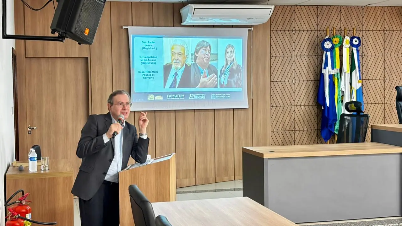 Ao longo da palestra, ele apresentou a evolução dos Juizados Especiais em Mato Grosso, que atualmente abrangem áreas cíveis, criminais e da Fazenda Pública, além de iniciativas específicas como o Juizado Volante Ambiental, o Juizado do Torcedor e o Serviço de Atendimento Imediato (SAI) para conflitos de trânsito.