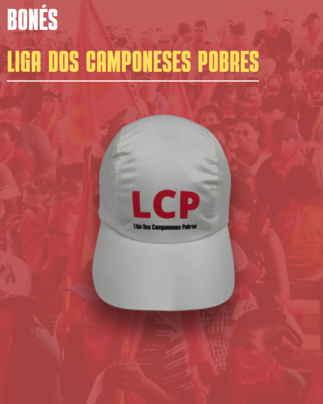 Boné de tactel vermelho estampado com o logo da Liga dos Camponeses Pobres. Informações do produto: Produto: boné; Cor: bege; Tecido: tactel (microfibra); Mo…
