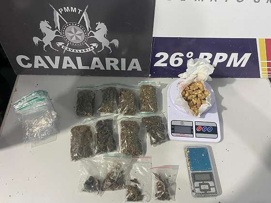 No imóvel, a Cavalaria encontrou um local usado para armazenar entorpecentes. Os policiais apreenderam diversas porções de maconha, cerca de 96 gramas de pasta base de cocaína, duas balanças de precisão e embalagens ziplock usadas no fracionamento da droga.