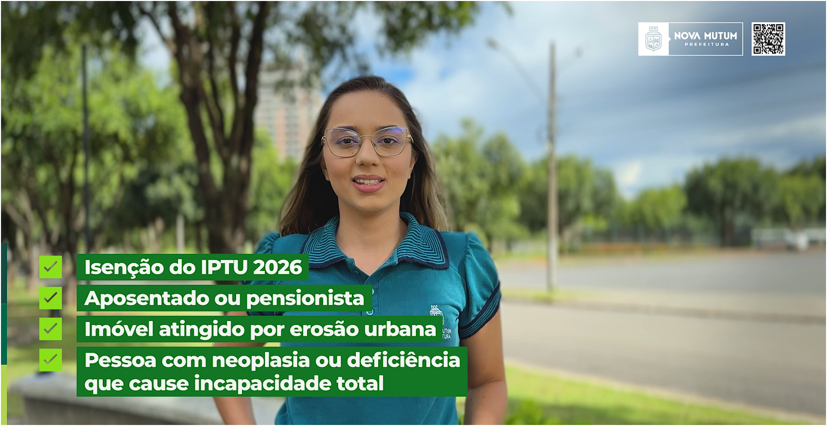 A Prefeitura de Nova Mutum informou que moradores que se enquadram nos critérios estabelecidos pela legislação municipal podem solicitar isenção do IPTU (Imposto Predial e Territorial Urbano) referente ao ano de 2026.