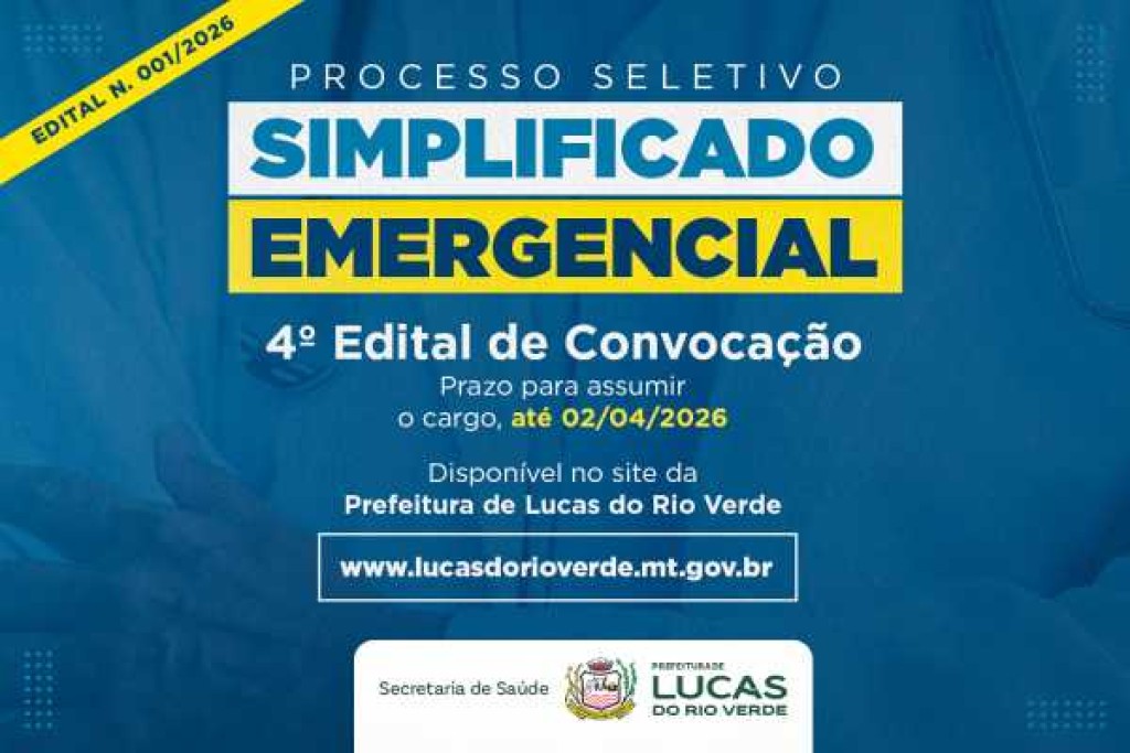A Prefeitura de Lucas do Rio Verde divulgou na manhã desta terça-feira (31), o quarto edital de convocação, referente ao Processo Seletivo Emergencial Simplificado (Edital n. 001/2026).