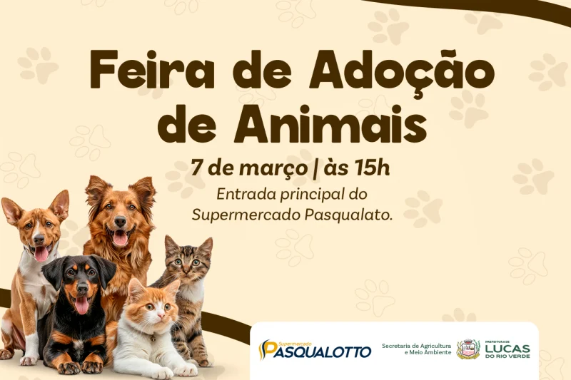 A Prefeitura de Lucas do Rio Verde, por meio da Secretaria de Agricultura e Meio Ambiente, em parceria com o Supermercado Pasqualotto, realiza neste sábado, dia 7, a primeira feira de adoção de cães e gatos do ano. A iniciativa tem como objetivo incentivar a adoção responsável e contribuir para a retirada de animais das ruas, oferecendo a eles a oportunidade de encontrar um novo lar.