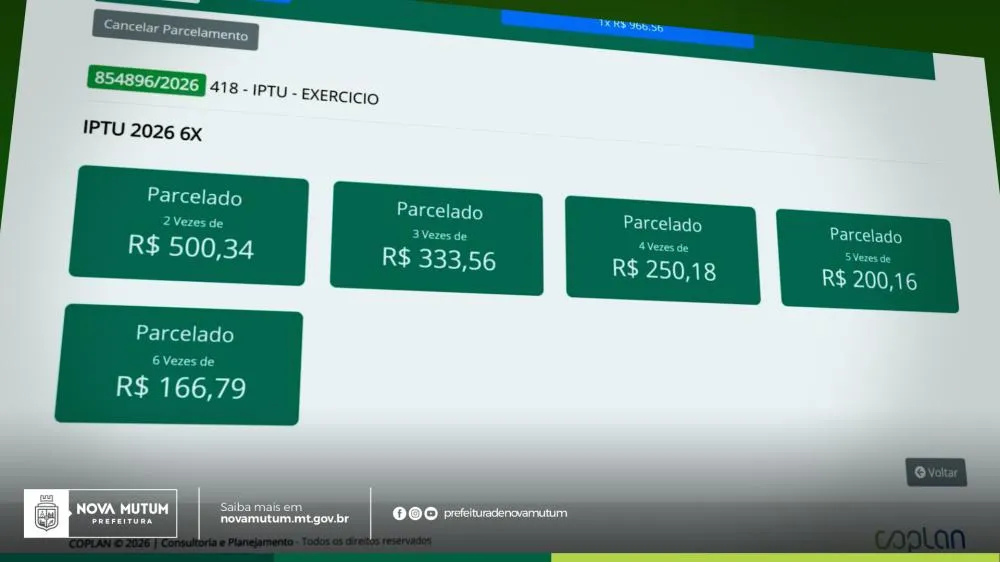 Os pagamentos podem ser realizados de forma ágil e segura no Setor de Tributos da Prefeitura, via WhatsApp oficial ou no site do Governo Municipal ( www.novamutum.mt.gov.br ).