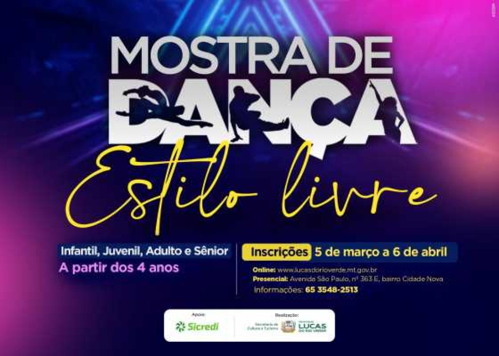 A Prefeitura de Lucas do Rio Verde, por meio da Secretaria Municipal de Cultura e Turismo (SMCT), abriu as inscrições para a Mostra de Dança 2026, evento cultural que tem como objetivo valorizar, difundir e incentivar as diversas linguagens da arte da dança presentes no município. As inscrições são gratuitas e seguem até o dia 6 de abril, por meio do link: http://192.168.173.169/forms/portal/form?id=64GRNQULK9C3THVZBWDP&categoria=106