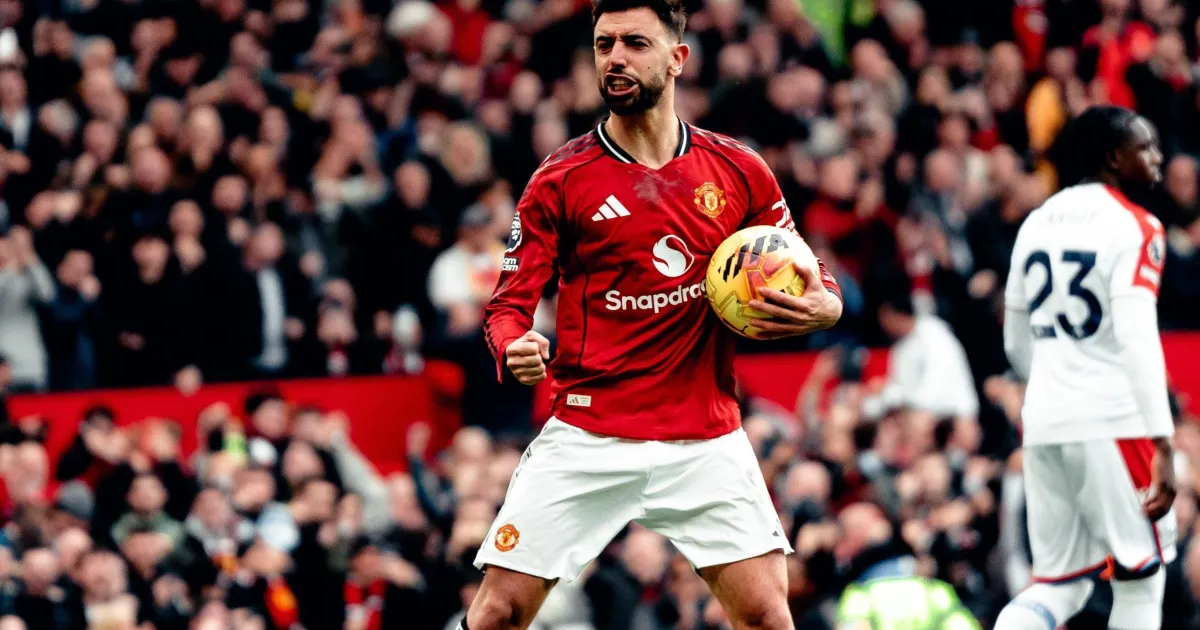 O capitão do Manchester United, Bruno Fernandes, converteu um pênalti e, em seguida, cobrou a falta que resultou no gol de cabeça de Benjamin Sesko na vitória de virada por 2 a 1 sobre o Crystal Palace, que terminou a partida com um jogador a menos, neste domingo (1º).