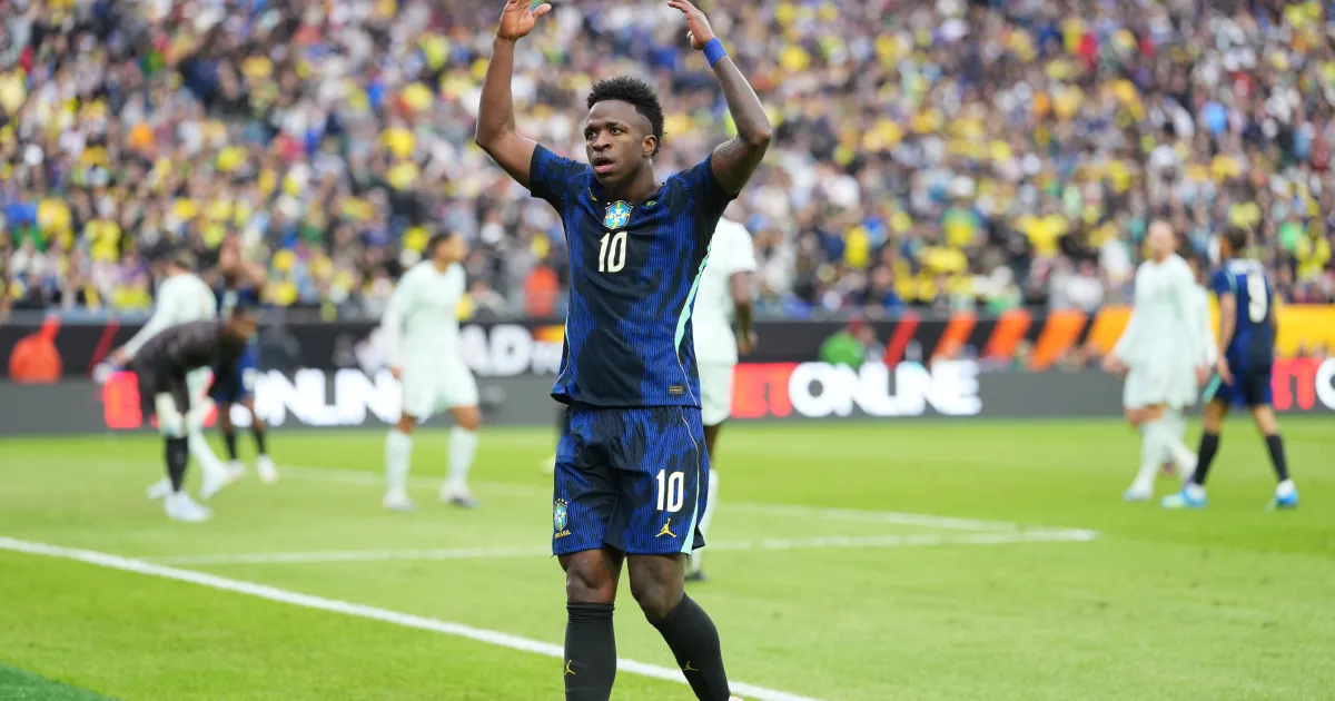 No último minuto do jogo, Bremer, que marcou o gol do Brasil, bateu cruzado pra área. Vini Jr. conseguiu chegar inteiro na bola, mas acabou perdendo o tempo e não conseguiu empatar.