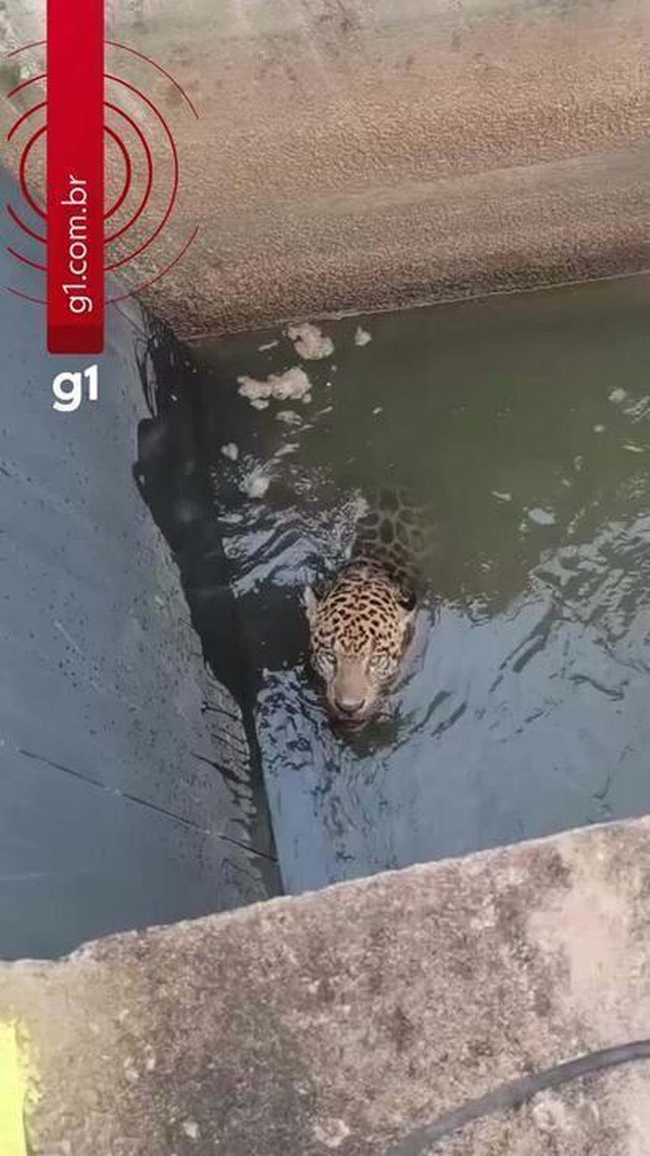 VÍDEO: Onça-pintada presa em canal de usina reage e esturra durante operação de resgate em MT