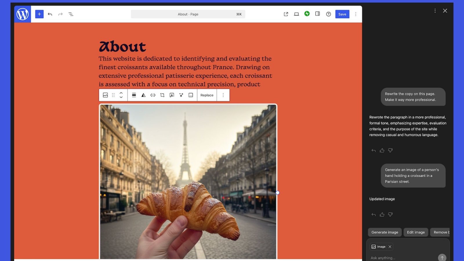 - No editor, também dá para fazer solicitações como “Mude as cores do meu site para que sejam mais vibrantes e chamativas” e “Gere uma imagem de um croissant para esta postagem do blog”;
